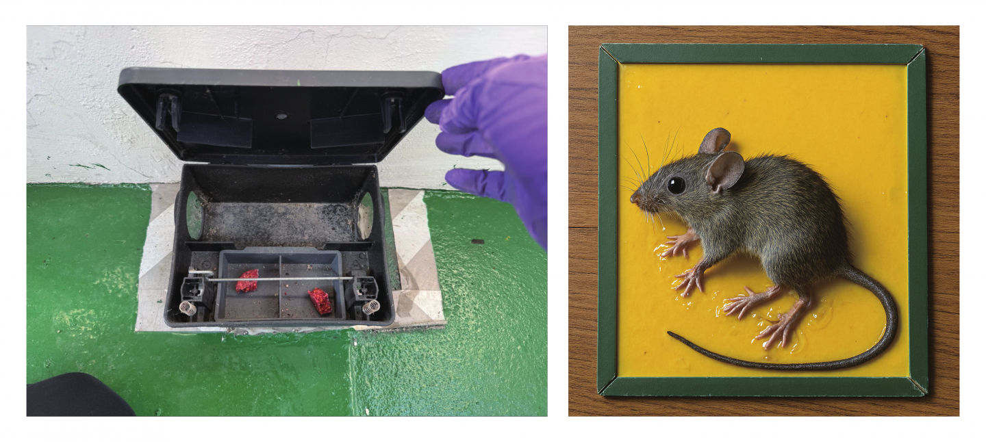 - 物理防治:主要以陷阱放式(黏鼠板、捕鼠器、超音波驅鼠氣)